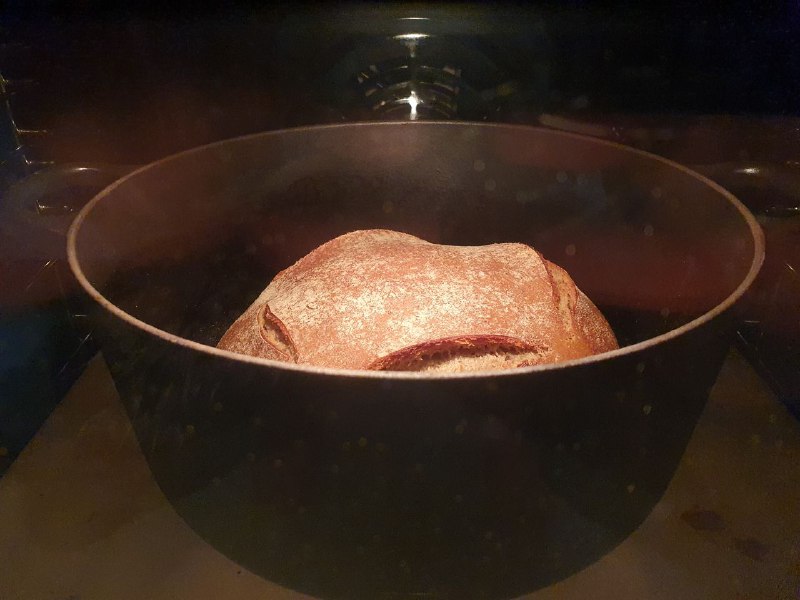 Ich backe in einem vorgeheiztem leicht am Boden bemehlten Gusseisentopf bei anfänglich 250° für 28min im vorgeheiztem Ofen. Anschliessend ohne Deckel aber mit einem Backpapier locker drüber für 25min bei 200° (hier länger oder kürzer führt zu einem Riss im Raum-zeit-Kontinuum und beschwört das Spaghettimonster, trust me, really, es ist sehr lästig, säuft alles Bier leer und weigert sich zu gehn), dann aus dem Topf nehmen, auf ein Holzbrett, Schüssel drüber und abkühlen lassen (kleinen Löffel oder so am Rand drunterlegen damit es es unter der Schüssel nicht zu feucht wird).