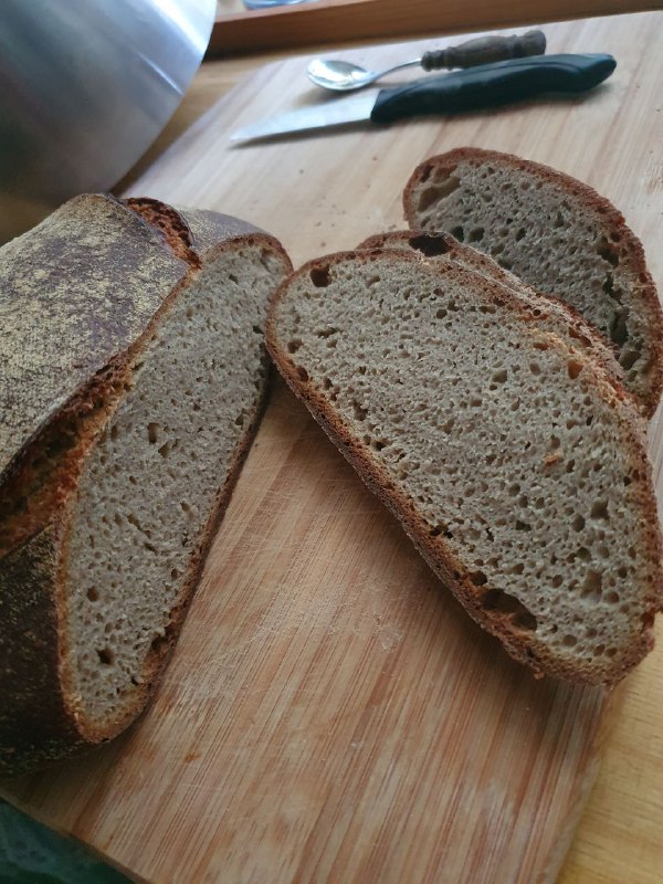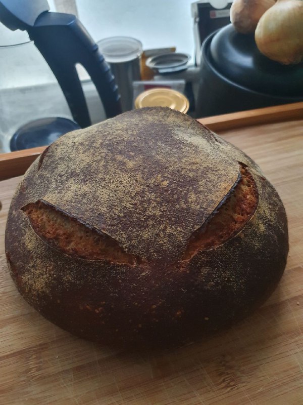 Bin sehr zufrieden mit dem Ergebnis, daher mal das Mischungsverhältnis und die Zubereitung meine letzten Brotes. Den Sauerteig habe ich morgens zusammengerührt mit 20g Sauerteig, 50g Mehl und 50g Wasser und dann bei Zimmertemperatur (~22°) bis Abends stehen lassen.