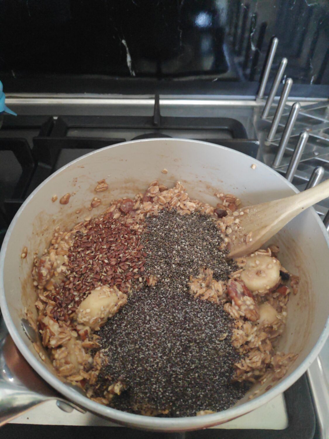 - Hitze ausschalten. Chia, Leinsamen, Mohn (heißer Tipp), Pekannnüsse untermischen, mit Datteln verfeinern. Voilà!